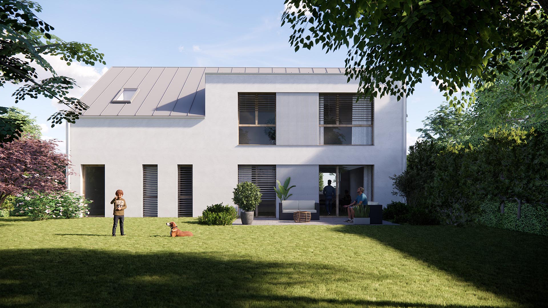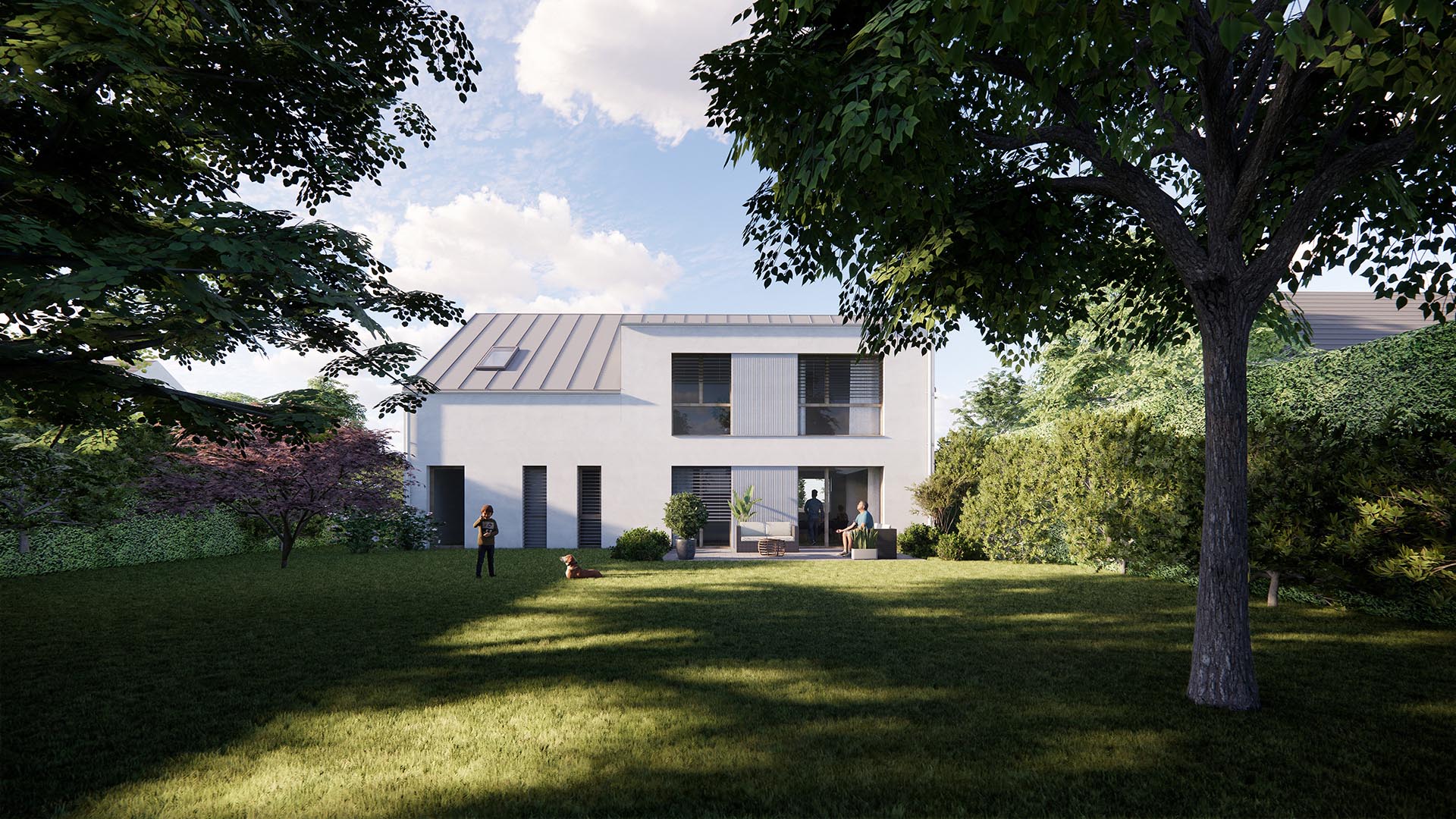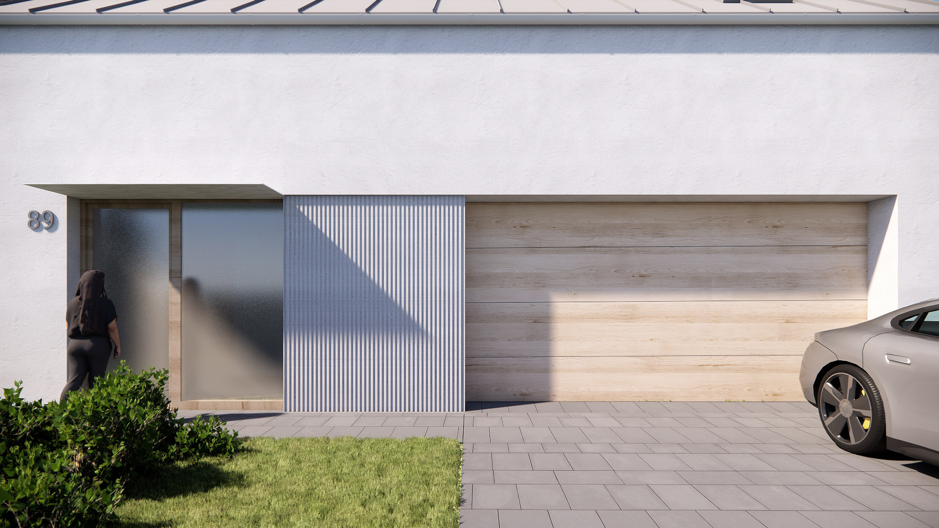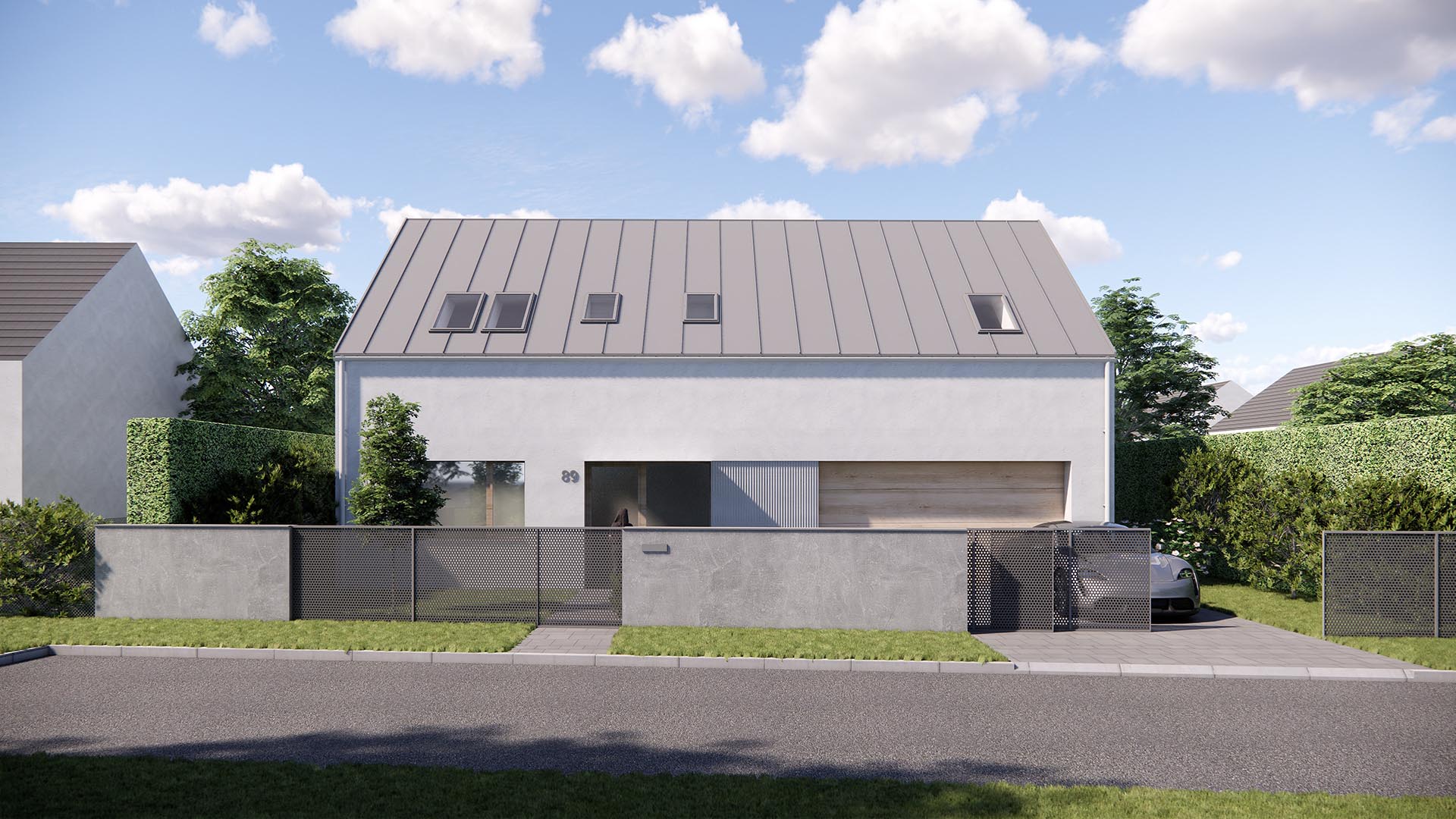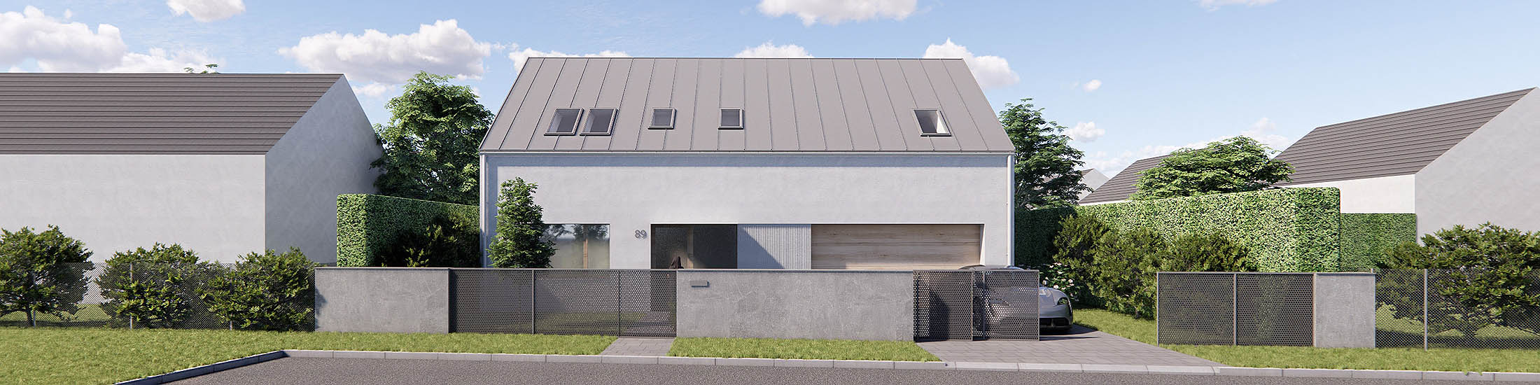 Stavba má obdélníkový půdorys a kompaktní hmotové řešení s přízemím a obytným podkrovím pod sedlovou střechou s mírným sklonem. Tento tvar zajišťuje optimální poměr mezi obestavěným prostorem a energetickými ztrátami, přičemž vytváří interiér s vysokou užitnou hodnotou. Hlavní fasáda směřuje do zahrady a je otevřena velkými prosklenými plochami, které zajišťují dostatek denního světla a vizuální propojení interiéru s exteriérem. Směrem do ulice dům působí střídmě a kompaktně, čímž zachovává intimitu obytných prostor. Materiálové řešení kombinuje přírodní omítku v tlumených odstínech, dřevěné akcenty a moderní výplně otvorů s izolačním trojsklem. Střešní krytina je v tmavém odstínu, harmonicky doplňujícím celkový vzhled.