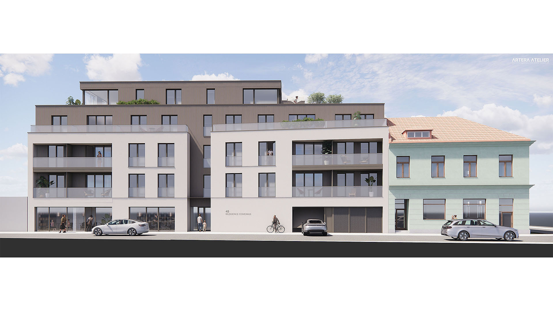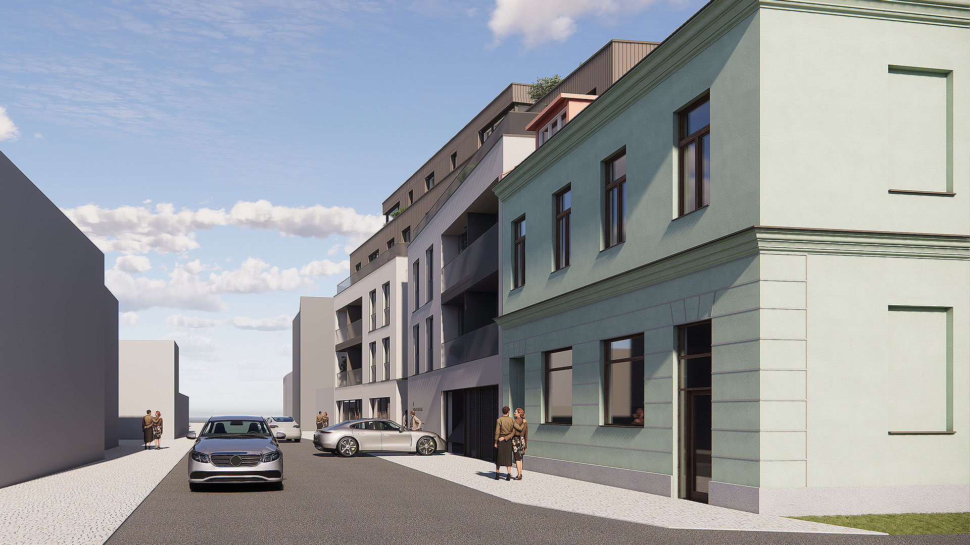 Členění na pravé a levé křídlo a jejich vzájemné odsazení umožnilo vytvořit mírně zapuštěný a jasně definovaný hlavní vstup. Funkčně i formálně odlišený parter nabídne příjemné členění na převládající komerční část, vstup, volný prostor pro úmístení názvu a čísla domu a otvor, vyplněný zámečnickým výrobkem, integrujícím garážová vrata, vstup a kontejnerová stání. Druhé a třetí podlaží od ulice je pojaté tradičněji a tvoří jej kombinace polozapuštěných teras a hladkých fasád, členěných francouzskými okny. Odsazené čtvrté a páté podlaží od ulice, pojednané v doplňkové tmavší profilované fasádě, citlivě doplňuje spodní podlaží a vytváří příjemné obytné terasy doplněné zelenou střechou.